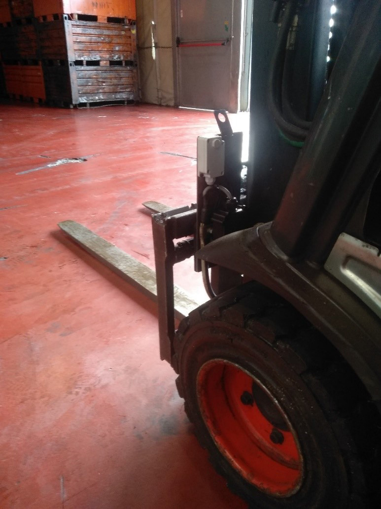 The positioning tag has been inserted on the fork of the forklift in order to monitor its position in the three-dimensional space, also allowing to trace the exact position of the materials, both on the individual shelves and on the possible stacks.
