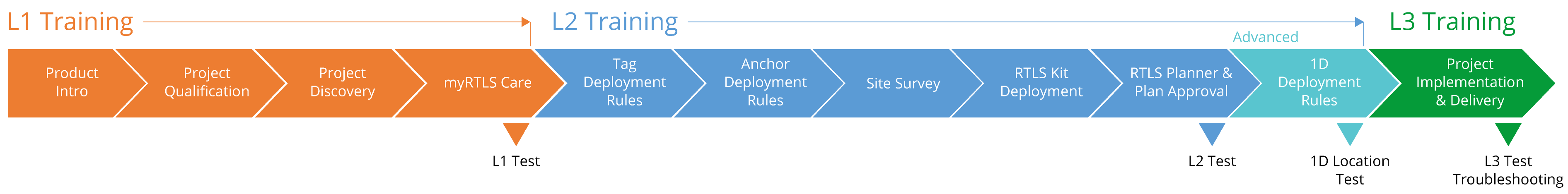 As shown below, the consecutive training levels correspond to the stages of your indoor tracking projects. The content and knowledge gained from each training level will help you to master each project stage and ensure you provide an unrivaled customer experience throughout the overall project.