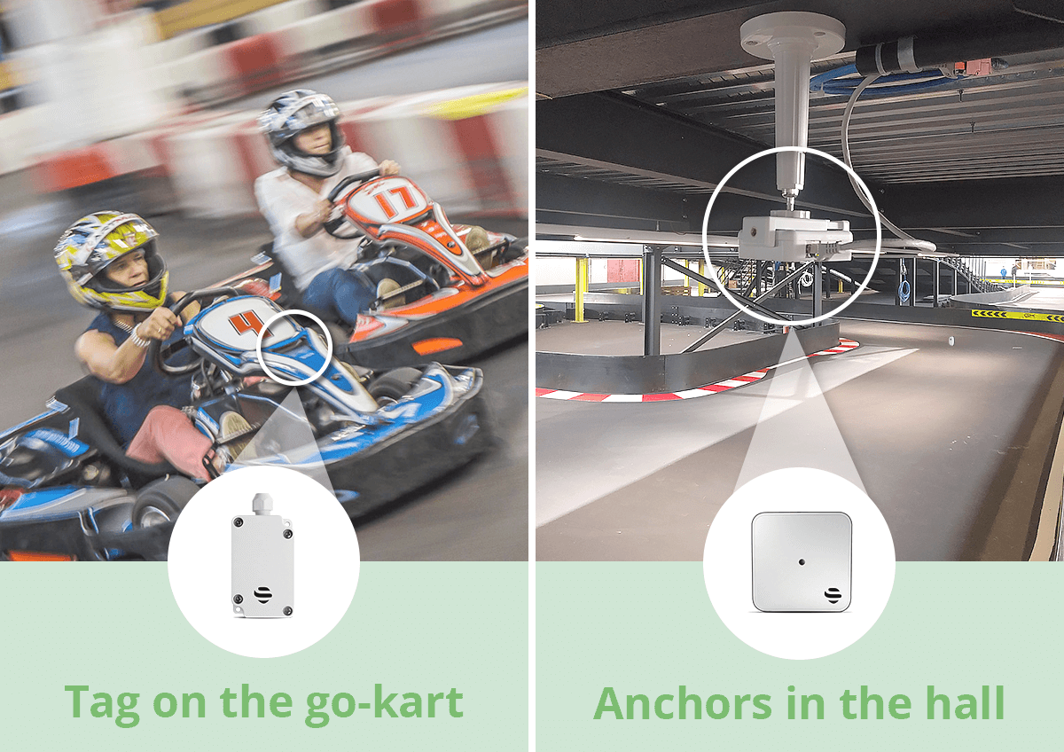Each go-kart is equipped with a tag that transmits a signal to anchors attached to the ceilings. The anchors then send the signal to the RTLS server and calculate the vehicle’s position in real-time. The tag is powered by the vehicle’s battery. Learn more about how UWB RTLS works.