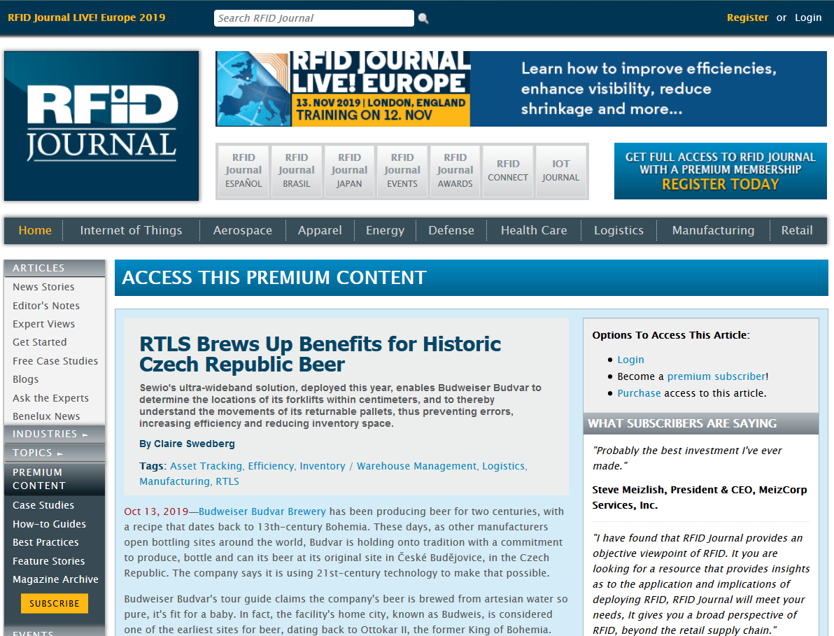 RFID Journal is a reputed and well respected independent media company providing news and insights exclusively about radio frequency identification technology and its application in a variety of industries like manufacturing, defense, retail, security.
