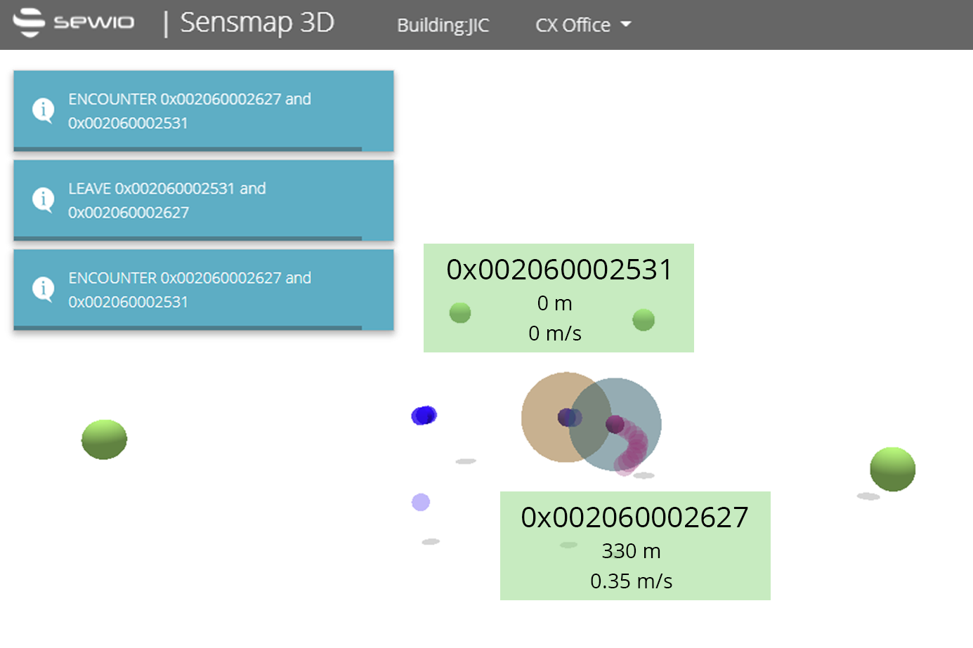 This allows alerting, reporting and tracing based on the proximity of two moving entities and the duration of their encounter. This feature brings the most benefit to employee safety scenarios, where the proximity of two moving objects can create alerts and warnings to prevent incidents and fatal injuries.