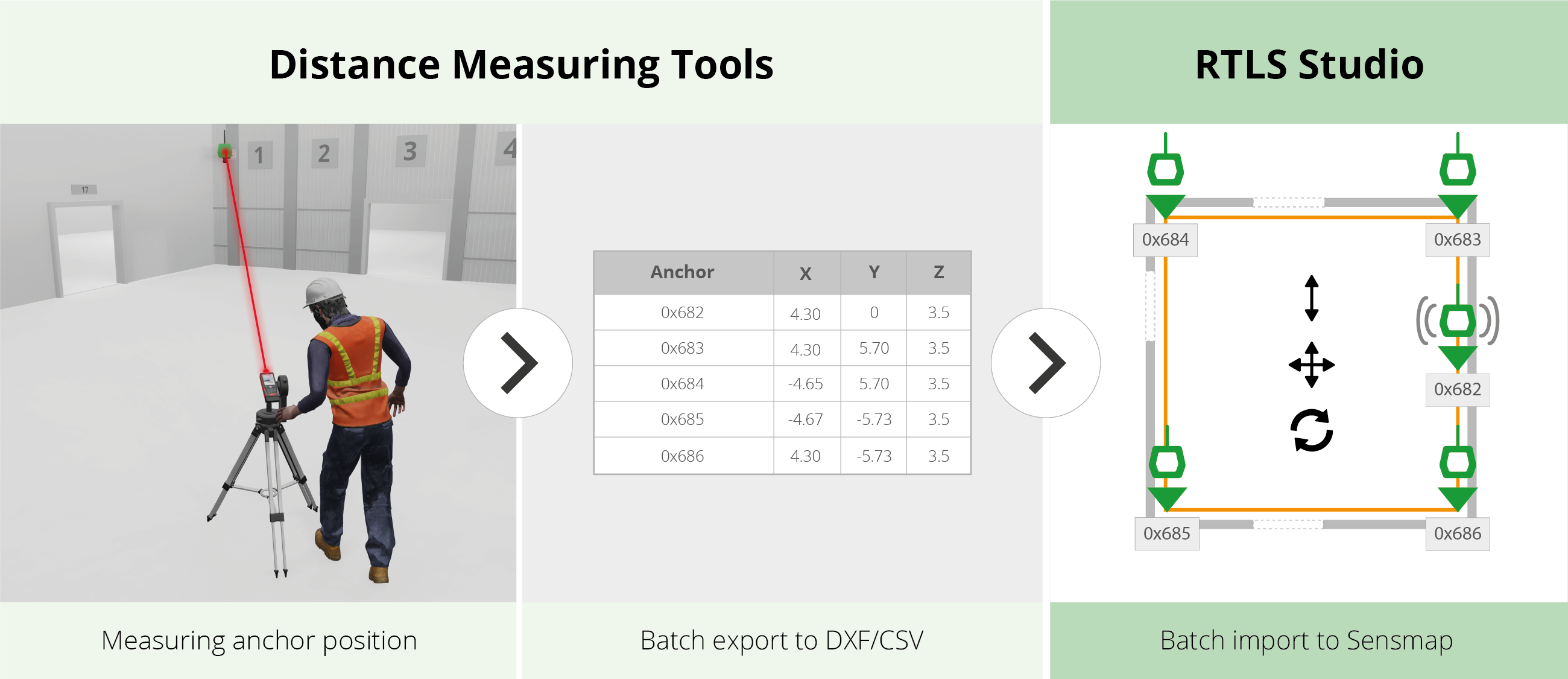 Version 3.0 allows you to import vector files, DXFs, enabling integration with tools such as the LEICA S910s digital measurement device. Use any preferred digital measurement device to get the exact coordinates for your anchors, and then export the data as a DXF (or CSV) file directly into your RTLS Studio. This ensures a faster and more exact way of importing your data as you no longer need to position each anchor separately in RTLS Studio.