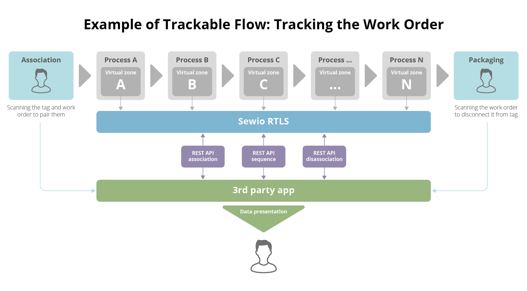 In addition to Trackables, RTLS 3.1’s API also allows customers to obtain the sequence – a specific order in which the Trackables moved across virtual zones representing each production stage. An excellent example of this feature is the trackable flow of work order in which a production manager can be alerted in real-time via a third-party app when the work order breaks the given sequence or time schedule.