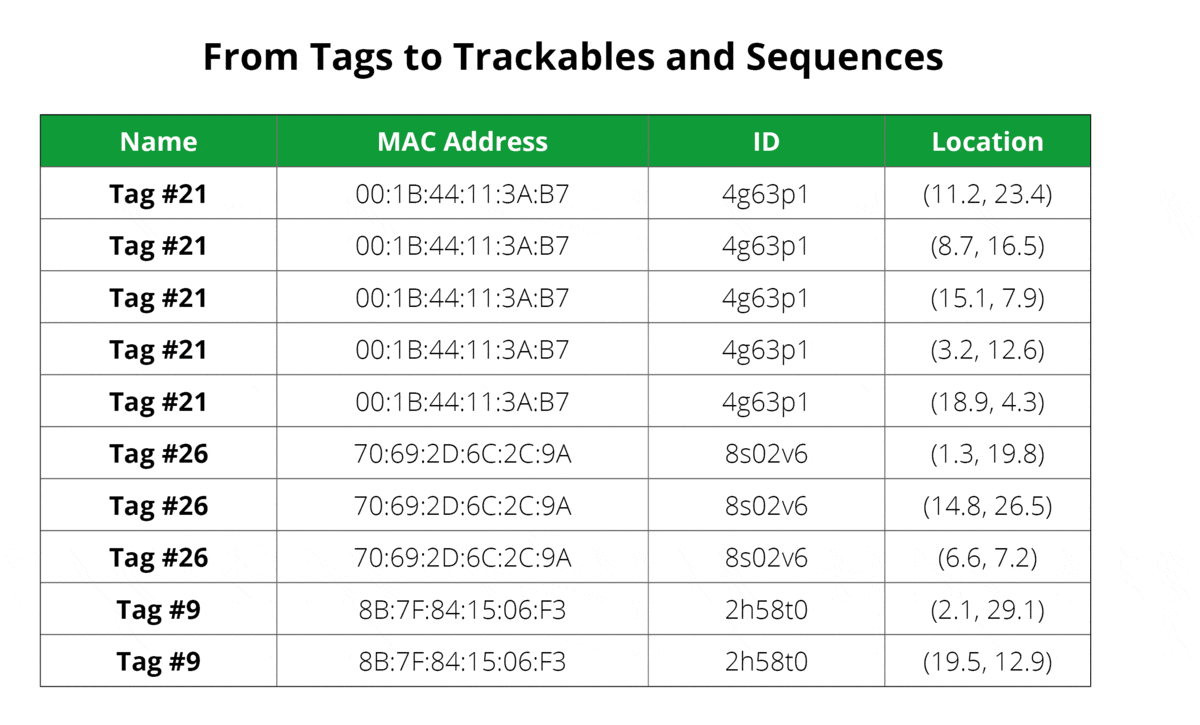 Trackables also significantly reduce the complexity of location data as they represent a subset of the initial raw data covering the millions of locations of thousands of tags into a much smaller and desired dataset. The simplification and speedup brought with trackables unlock new ways of working with location data.