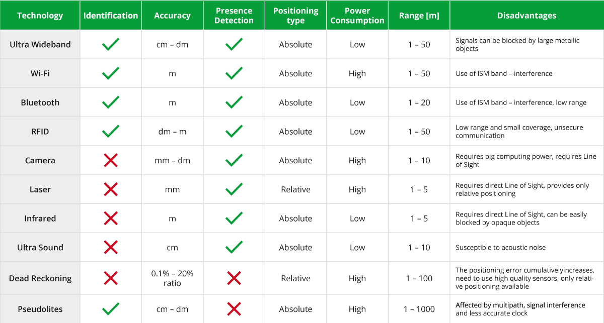 There are many technologies capable of indoor positioning out there. Each of them has its own advantages and disadvantages regarding accuracy, price, scalability signal coverage and so on. It is always up to the customer to decide what kind of performance is he expecting from the location system. While traditional technologies like Wi-Fi, Bluetooth and Active RFID can bring accuracy up to several meters, Ultra Wideband is more suitable for applications where the positioning accuracy is a critical parameter.